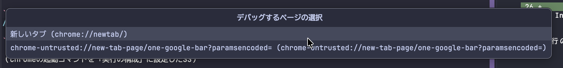 Chromeを起動してリモートデバッグを開始すると、少々見づらいですが接続するタブが選択肢として表示されるので選択しましょう
