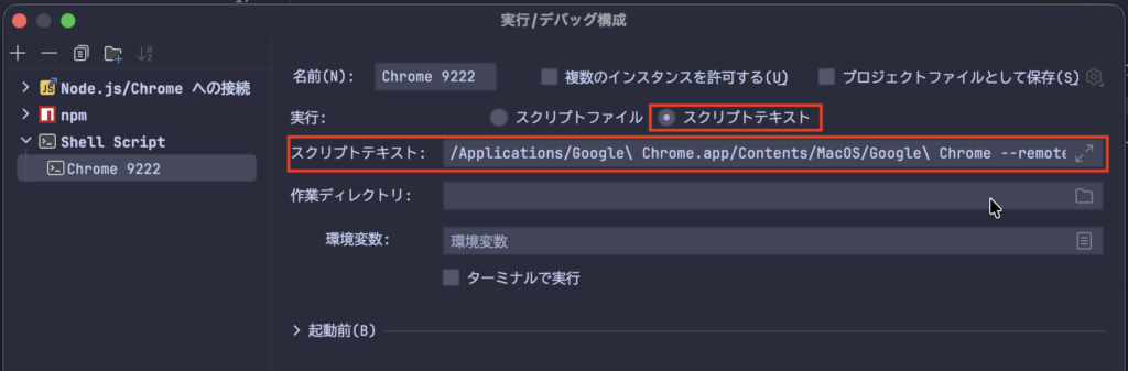 実行の構成にChromeの起動コマンドも登録してしまいましょう!